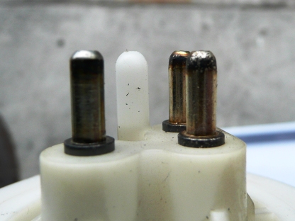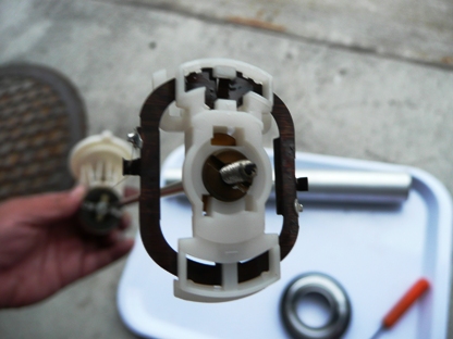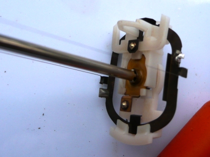 | フロートがシャフトを上下する。左右に細い金属があります。 上下することによって抵抗値が変わるらしい。 |