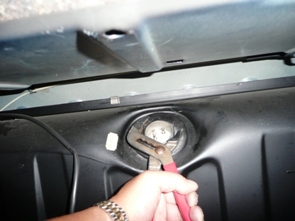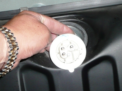 | 2011年10月5日(水) 走行 338,830Km もう5〜6年前からでしょうか、メーター内のガソリン残量計が半分くらいになるとピョコピョコ跳ねる現象が発生。 年4〜5回そんな症状になるだけなので放置していました。 今日ガソリン残量も少なく、また暇でしたのでフューエルセンダーユニットをお掃除してみます。 多くのサイトで紹介されてますね。 トランクのタンク側のカバーを外すと現れます。 |
