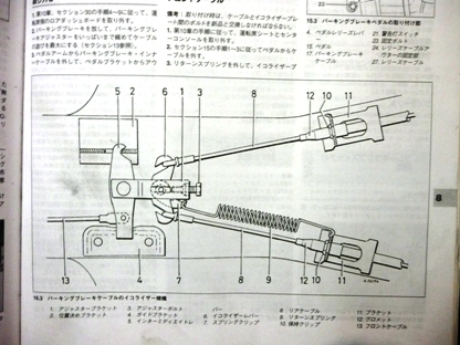 | こちらにもブレーキグリスを塗ります。 この状態でパーキングブレーキを動作させてみたところ正常にワイヤーは動作していました。 一安心。 ここで正常動作していないようなら他に問題があることになります。 |