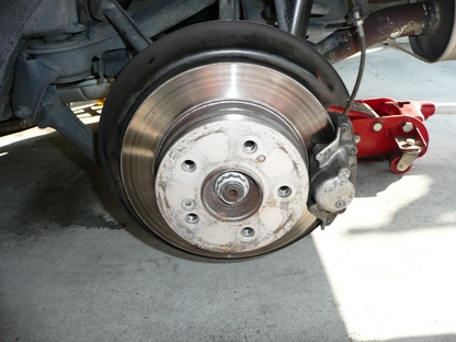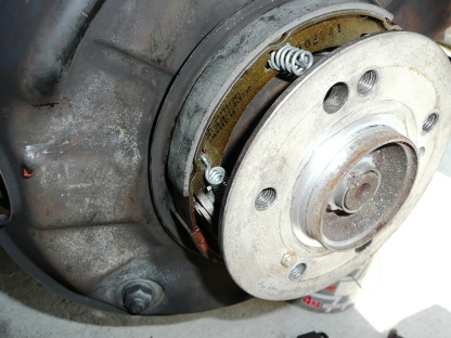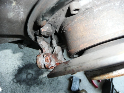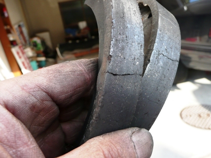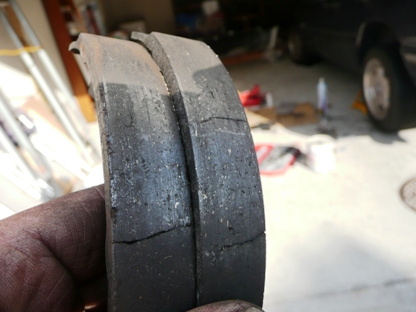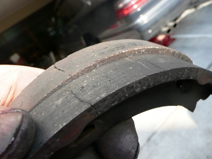 | 解除が正常にできていなかった左リアのシュー 引きずったせいか亀裂が・・・ |