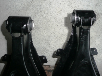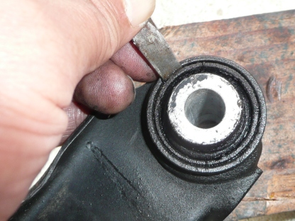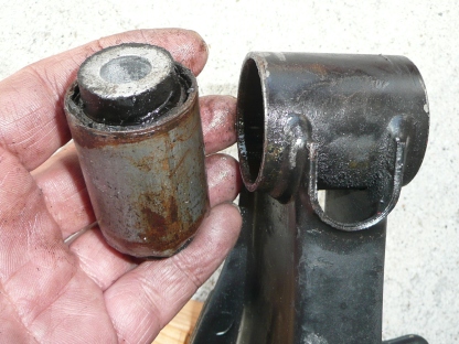 | これに新品ブッシュを装着しリペイントして使用することにします。 車体からの脱着作業時間が短縮できます。 ブッシュ、確かにしっかりしてますが、新品に交換しておきます。 |