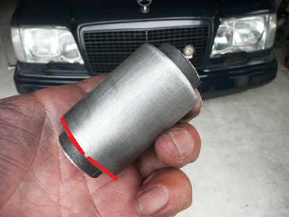 | 2011年11月5日(土) 次は着を行います。 新品ブッシュ外周をサンドペーパーで軽く磨きます。 差し込む側の角も少し削っておきます。(赤色部分) |