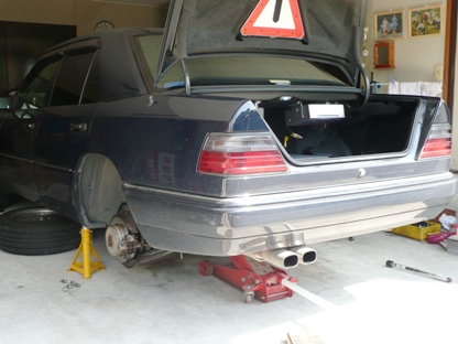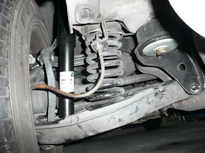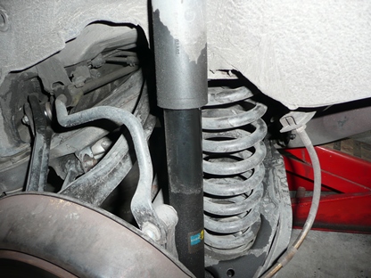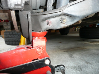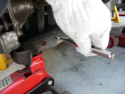 | アブソーバーを外した時、ロアアームが下に下がってコイルが飛び出ないよう下側からジャッキで支えておきます。 | ![]() |