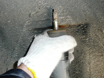 | 新しいものを取り付けます。 テコの原理でスパナを利用して縮めました。 |