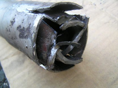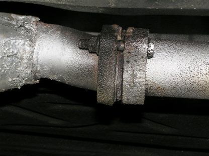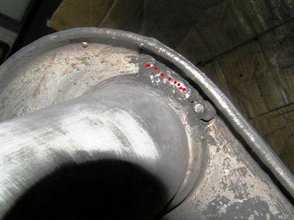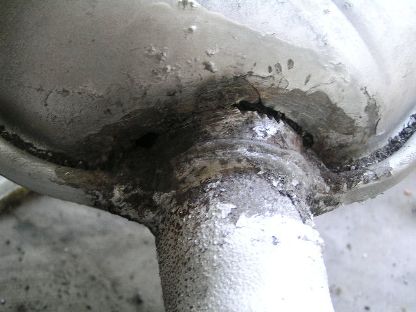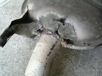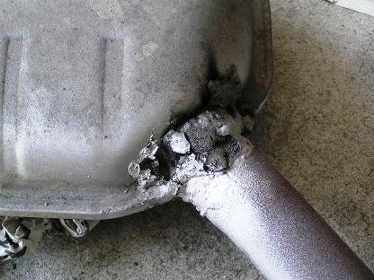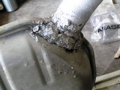 | さて取り外したマフラーのセンター部分 タイコの前後・上下、亀裂を補修しています。 音も静かでした。イヤ、ちょっぴり漏れる音がしてたかも。 |