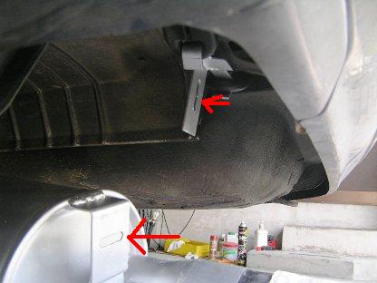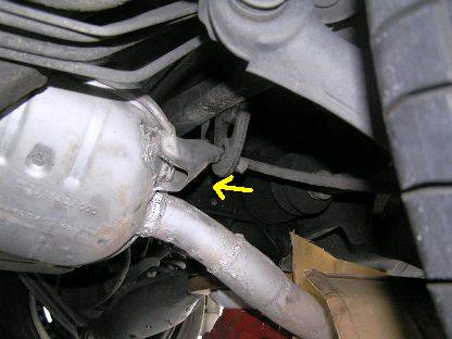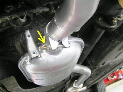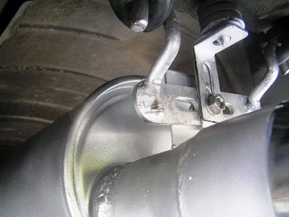 | 画像にはありませんが、マフラー下に適当な大きさのダンボール箱を用意して、マフラーを受け止めるようにします。 後はマフラーを吊り下げているこのゴムを外し、 |
