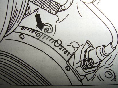 | TDC(0/T)マークにあわせます。 OとTの刻印の間の | にあわせます。 1番先端のシリンダーのピストンの上死点(爆発)の位置です。 |