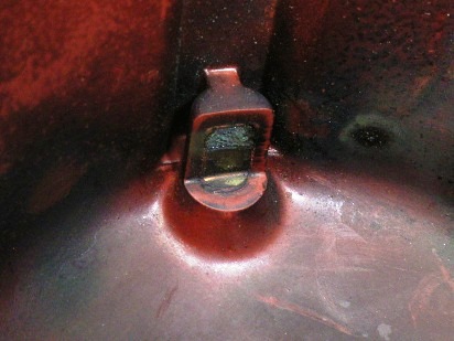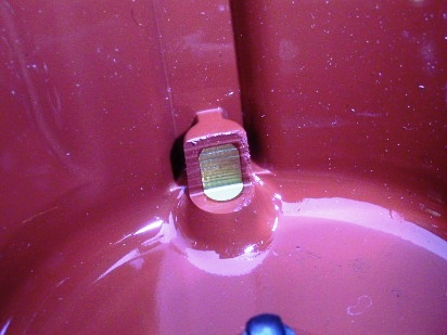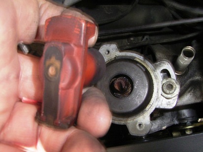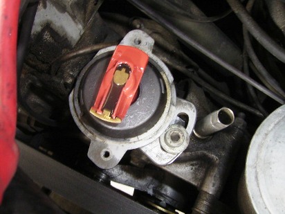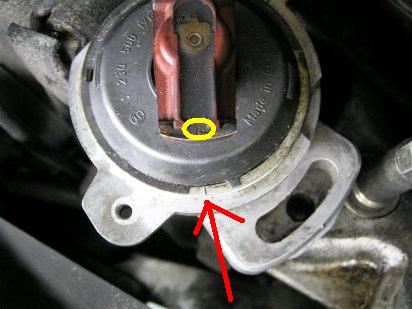| デスビのココに刻みがあります。この刻みは1番シリンダーに通電する位置です。 ここにデスビローターの先端が向くようにデスビ本体を差し込みます。 これでエンジンが掛からなかったら、ローターを180度向きを変えるか、クランクをもう1周まわしてローターの位置を合わせ直してください。 以上で終わりです。 |