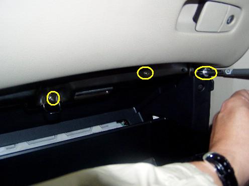 | グローブボックスが2段あるのですが下側のふたを開けると上部にネジが5本(画像では3本しか映ってませんが)見えますので外しちゃいます。 | ![]() |