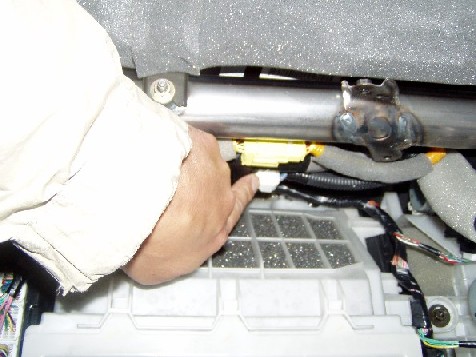 | さて、ここが最大の不安箇所です。 DVDチェンジャーのコネクター差込み口があるのかどうか? あるとすればチェンジャーのコネクターの届くこのあたりにあるはず。 黒いビニールテープで盛り上がった所のテープをずらしてみます。 白いカプラーが露出します。 コレが他に繋がってたらOUT |