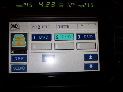 | 純正DVDチェンジャーをとりつけると、自動的に右の画面が追加されるようです。 画像は3枚DVDを挿入した状態。(6連奏です) DVD−Rも正常に再生されました。 |