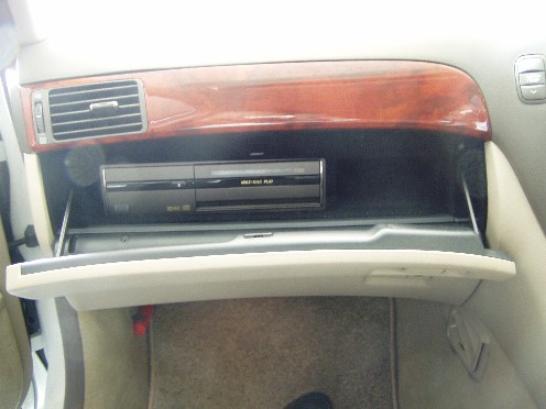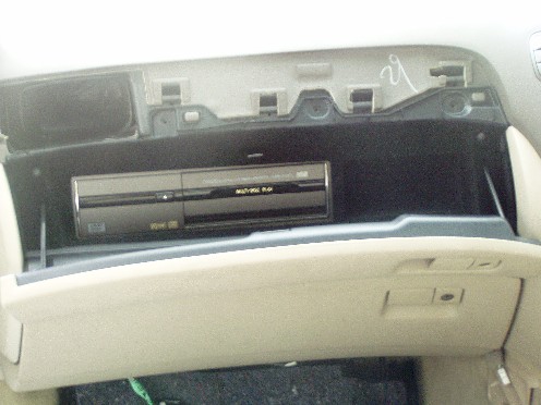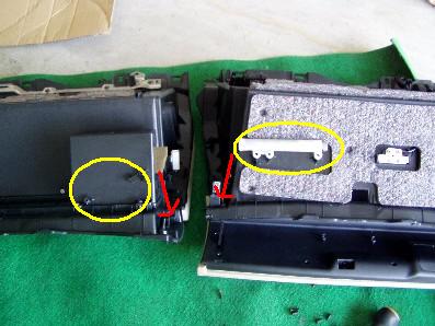 | 横道にそれました・・・ さて、次はグローブコンパートメントパネルの移植です。 いくつか部品を外す必要があります。 次々に外して移植していきます。 グローブボックス上段の蓋 既存の物は左に紐が付けられています。 DVD用は右側に。 |