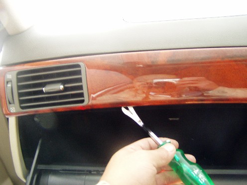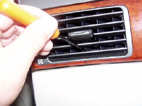 | サイドのエアコン吹き出し口を覗くと、上下に爪が見えます。 マイナスドライバーで押し込むと外れます。 |