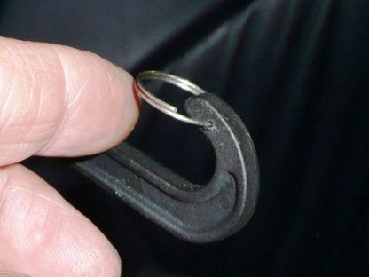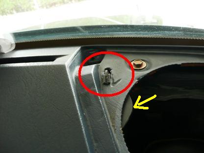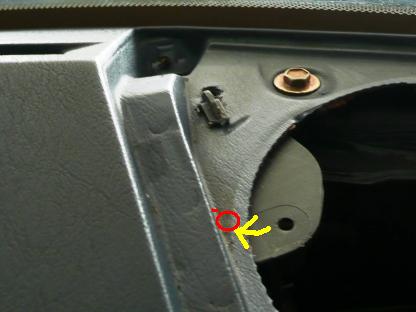 | 突き出して、穴を開けてみました。 フックを引っ掛けてみました。 向きをグローブボックス蓋のヒンジ方向に向けます。 黄色の矢印部分がスピーカーに干渉し、邪魔になります。・ |