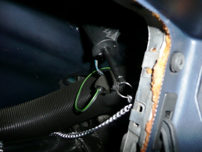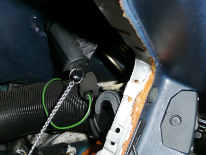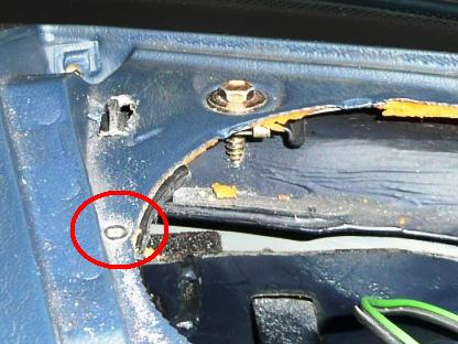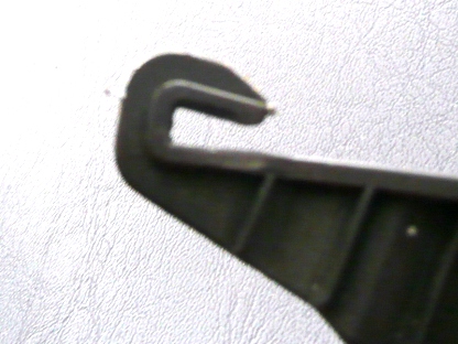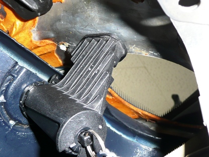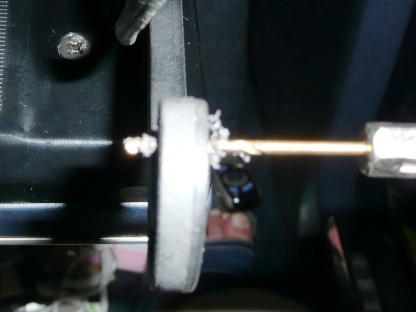 | さて、自車を観察 引っ掛けるであろう位置の鉄板にウレタンが露出しています。 マイナスドライバーでつついてみると鉄板に穴が開けてあるようです。 |