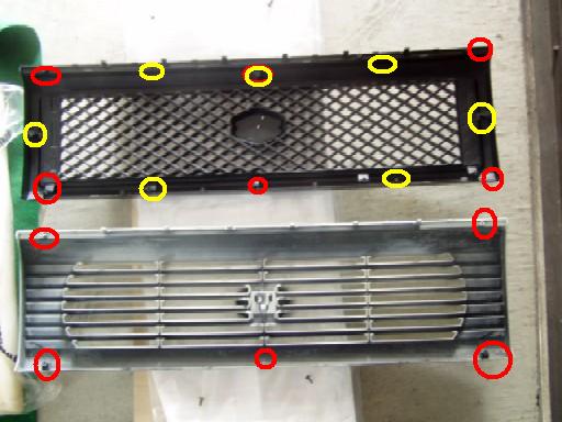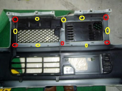| 第二段階 グリルを外します。赤丸のネジ5ケを外して、引っ張れば外れます。 しかし、これバンパーって言うより、ただのカバーですね。 |