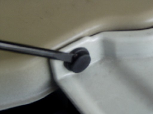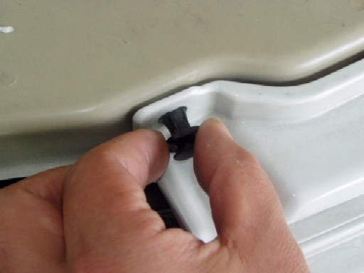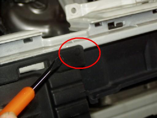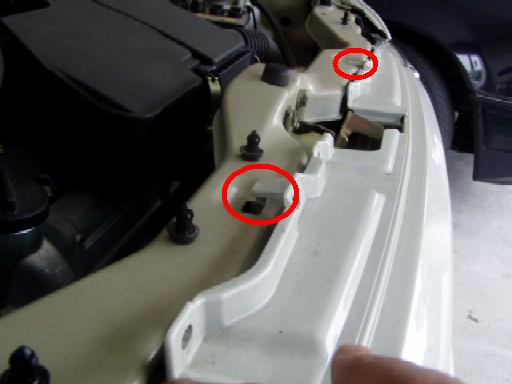 | さて、既存のグリルはボンネットを開けて観察したところ、どうもバンパーと一体になってるみたい・・・ まずはクリップを外します。上部4カ所 マイナスドライバーを差し込んで、少し持ち上げます。 |