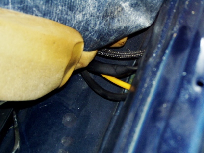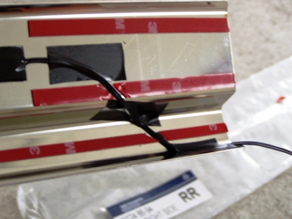 | 車に取り付けた時、配線を車内側へ引き込みたいので車体側へ寄せておくんです。 純正のモールに貼り付けて、車体に取り付けます。 |