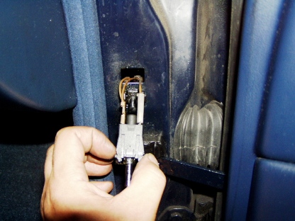 | ドアの照明の配線を見てみます。 う〜ん、やはり茶色に白線・赤色に白線ですねぇ。 この線の繋がってる車内の配線が探せれば良いのですが・・・ |