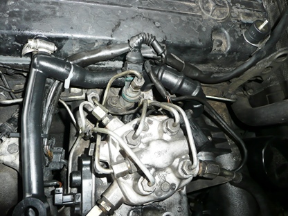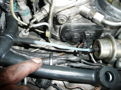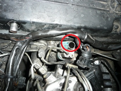 | 2016年9月11日(日) 走行421,655Km アイドルエアーバルブを外していたらホースが折れました。 ゴムなのにプラスチックのようになっていました。 画像の所に残った残骸は、マイナスドライバーの先をあてがって、金槌でたたいて割って取り除きました。 |