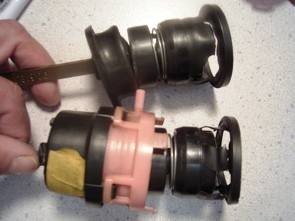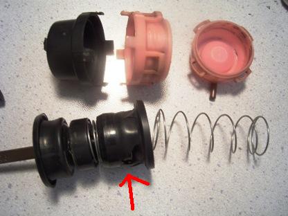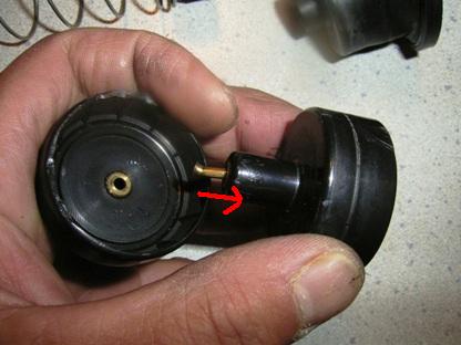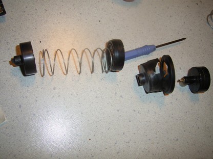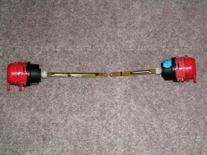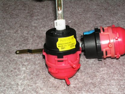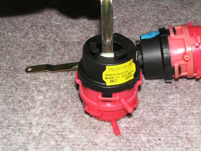| 中に引っ込む(ステーが縮む) トモさんのお車は、この中のゴムに穴が開き内気・外気の切替不能になったそうです。 私の車もコレの交換で解決するといいなぁ〜。 |