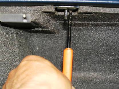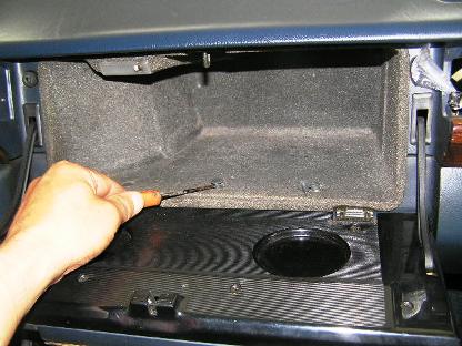 | トモさんの車についているグローブボックスの蓋がゆっくり開くダンパーは私の車には見当たりません。 ココのネジとクリップを外します。 |
