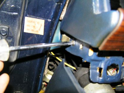 | 運転席側へ移ります。 画像を撮り忘れましたが、画像上に見えるはずのパーキングブレーキ解除の取っ手下にあるネジ2つを外し、画像のボンネットオープナーのネジ1つ外します。 |