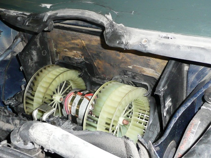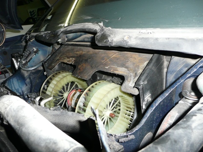 | 2010年7月3日(土) 走行320,439Km 以前内気・外気の切替が出来なくて部品交換したんですが、蓋が途中で何かに干渉しているようで、今回エバポレーター清掃をかねて原因を調べます。 ブロアーファンカバーのクリップに干渉していることが判明しました。 |