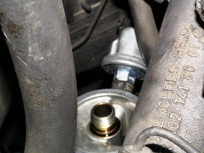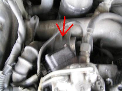 | 2007年3月9日(金) 走行264,009Km オイル&オイルフィルターが交換時期になりましたので、上記の部品の交換もします。 オイルフィルター土台の横に刺さっているのが油圧センサー |
