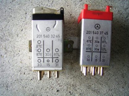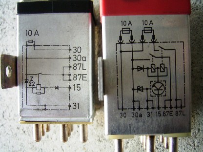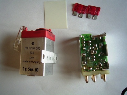 | 私の車のオーバーボルテージリレーはつい最近(2002年5月2日:190,565Kmのときに右側の通称「対策品」に交換してます。 何が対策されたか興味のある方は1つ前の配線図をご覧ください。 この「対策品」と言う呼び名から、この部品は大丈夫と言う先入観がありました。 |