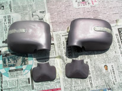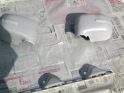| オークションサイトを見たら即決価格\9,000-で出品されていたので即購入。 色がブドウみたいな色なので、缶スプレーでパールホワイトに変身させます。 ウインカー部分は接着されていて取り外すことができませんでしたのでマスキングします。 |