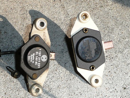 | 家に帰って再度取り外して記念撮影。 右の物2005年6月購入3,200円+送料200円、 私の車のオルタネーターは走行15万キロ位でリビルトに交換しています。 リビルトBOSCH 0 986 033 730は 新 品 BOSCH 0 129 480 321に対応 ボルテージレギュレーターはBOSCH 1 197 311 022 それに対応するK・A・E製 |