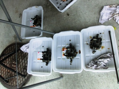 | ロッカーアームアッセンブリー1セットづつ作業するのも面倒なので、4セットとも取り外しました。 間違えないように容器をそれぞれ用意。 |