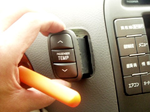 | 次に左右のエアコン室温調整スイッチを外します。 マイナスドライバーを差し込んで持ち上げます。 多少周りがへこんでも、復元します。 |