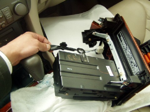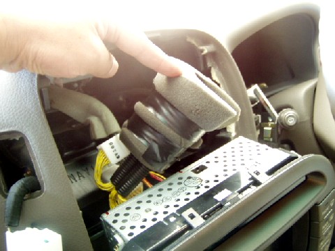 | スポンジを探してきます。ちょっと大きすぎたかな? 内部で音がコトコトしないようにTVデコーダーを巻きつけます。 後は元に戻すだけ。 |