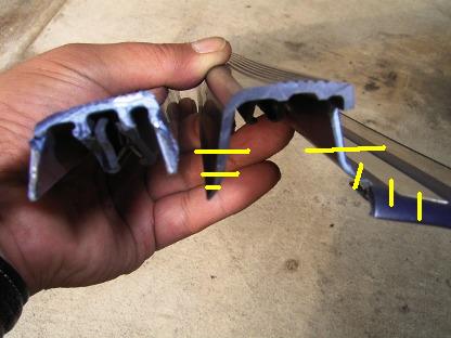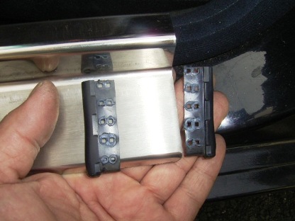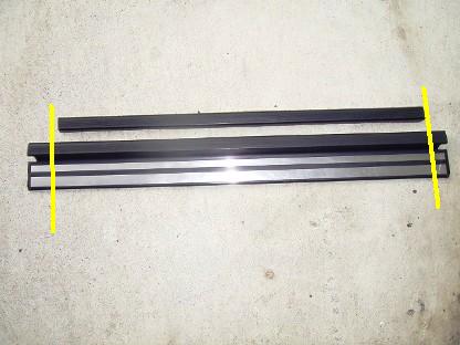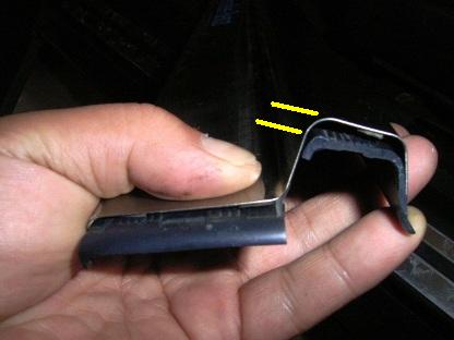 | が・・・・・ 次の日、凸部分を少し力をこめて持ち上げると外れてしまいます。 やはりレールにしっかり固定しておいたほうが良さそうです。 純正エントランスモールの必要部分だけ切り取って使用することにします。 画像左側のようにします。 |