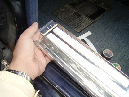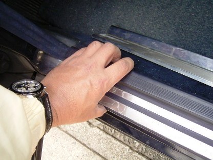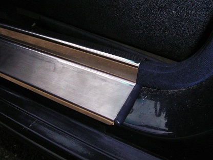 | レールにはめ込んで上部に両面テープを貼り付けて、ステンレスエントランスモールを貼り付けます。 今度こそ完璧です。 (画像はフロント右側です) 2005.10.26記 |