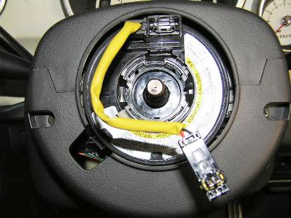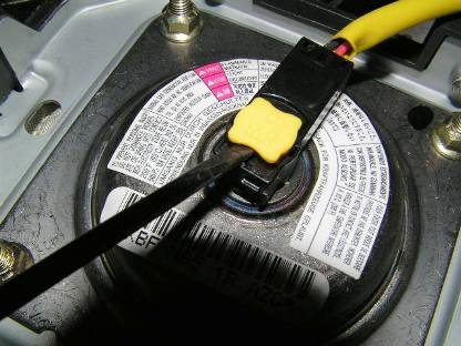 | 反対側のエアバック本体に繋がってる方 こちらの黄色の部品が何のためにあるのか気になります。 試しにマイナスドライバーを差し込んでみると上に浮き上がらせることができました。 |