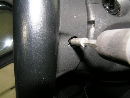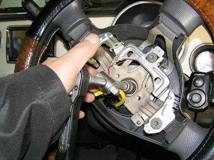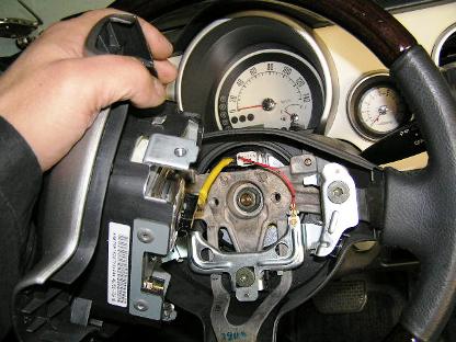 | エアバックつきのステアリングなんて外した事がありませんので少々不安。 念のためバッテリーのマイナス端子を外して作業します。 途中でエアバックが開いてしまっては目も当てられませんから。 ステアリング左右にネジがあるので外してみます。 |