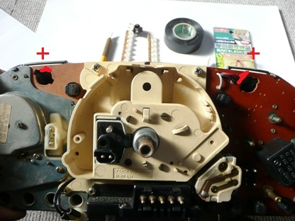 | ナイフでメーターケース上側の白いカバーの4か所を削り、外します。 | ![]() |