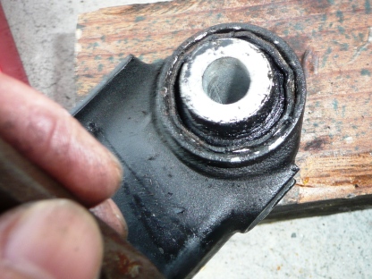 | これに新品ブッシュを装着しリペイントして使用することにします。 車体からの脱着作業時間が短縮できます。 ブッシュ、確かにしっかりしてますが、新品に交換しておきます。 |