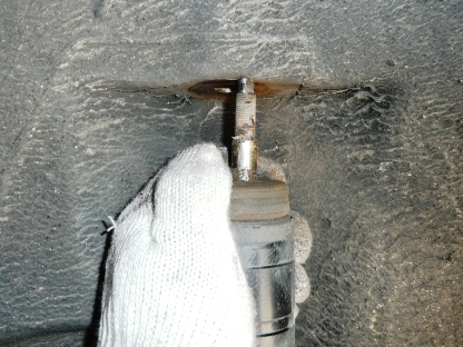 | 新しいものを取り付けます。 テコの原理でスパナを利用して縮めました。 |