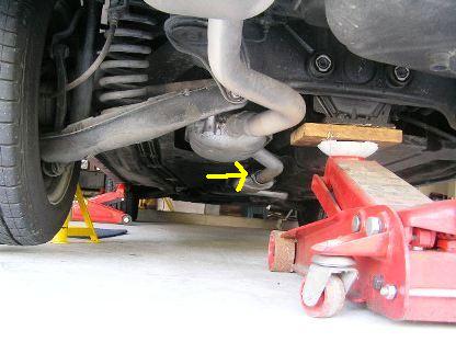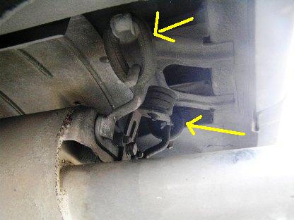 | 画像にはありませんが、マフラー下に適当な大きさのダンボール箱を用意して、マフラーを受け止めるようにします。 後はマフラーを吊り下げているこのゴムを外し、 |