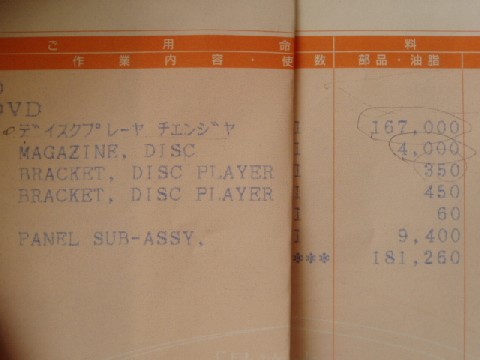| 11月にディーラーに聞いてみました。 見積もりをもらいましたが、100%装着できるかどうかわからない&返品はきかない。との回答でした。 また、金額も右のとおり。 ディスクプレーヤーチェンジャー167,000 ディスクマガジン 4,000 ブラケット 350 ブラケット 450 パネル・アッシー 9,400 空欄・・・ネジかな? 60 合計181,260円も・・・・・・・・・・・・・ コレに消費税足すと \190,323- ひぇー |