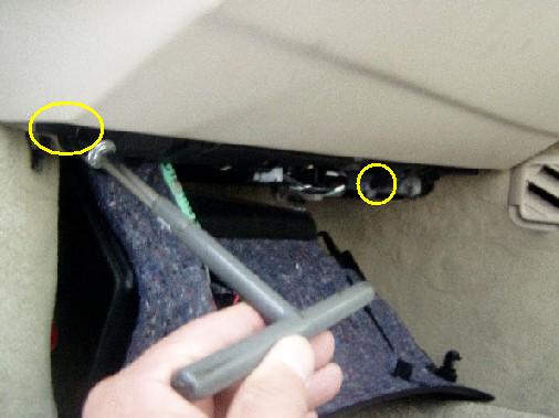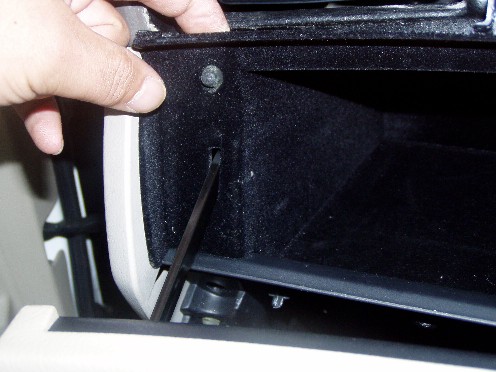 | グローブボックスが2段あるのですが下側のふたを開けると上部にネジが5本(画像では3本しか映ってませんが)見えますので外しちゃいます。 | ![]() |