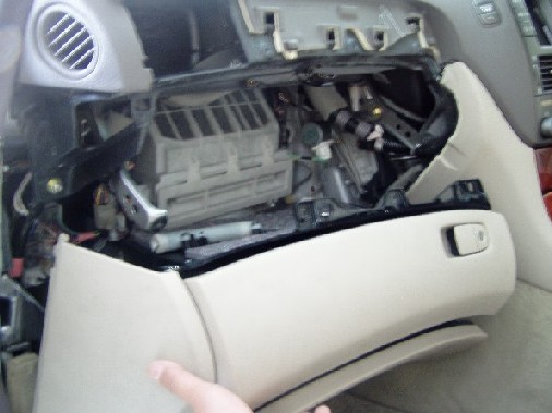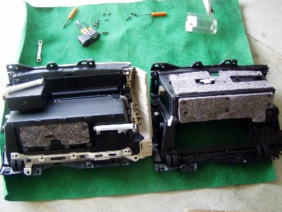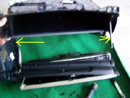 | 横道にそれました・・・ さて、次はグローブコンパートメントパネルの移植です。 いくつか部品を外す必要があります。 次々に外して移植していきます。 グローブボックス上段の蓋 既存の物は左に紐が付けられています。 DVD用は右側に。 |