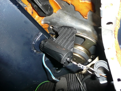 | 突き出して、穴を開けてみました。 フックを引っ掛けてみました。 向きをグローブボックス蓋のヒンジ方向に向けます。 黄色の矢印部分がスピーカーに干渉し、邪魔になります。・ |