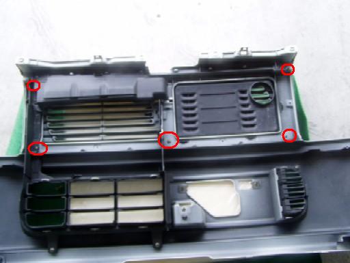 | 第二段階 グリルを外します。赤丸のネジ5ケを外して、引っ張れば外れます。 しかし、これバンパーって言うより、ただのカバーですね。 |