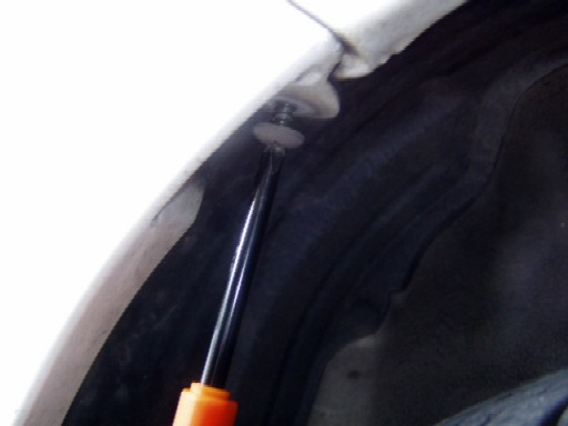 | さて、既存のグリルはボンネットを開けて観察したところ、どうもバンパーと一体になってるみたい・・・ まずはクリップを外します。上部4カ所 マイナスドライバーを差し込んで、少し持ち上げます。 |