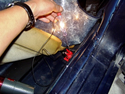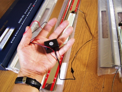 | 配線方法はいろいろ考えられますが、ドアの照明と連動させることにします。 常時電源(バッテリー)とナイナス(アース) 昼夜関係なしに、ドアを開けると光るように。 夜、ライトをつけた時のみ光るようにするならイルミとアース キーを廻した状態の時のみ光るようにするならアクセサリーとアース、 |